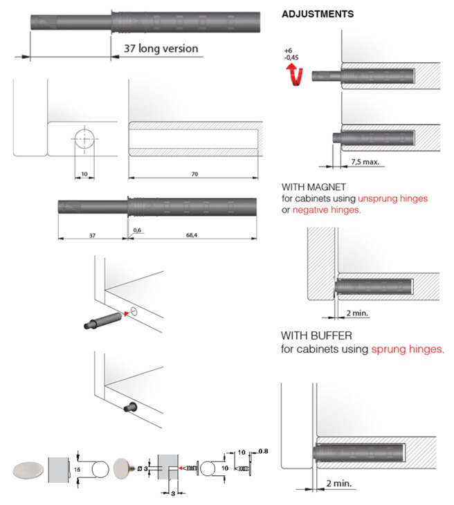 Used to provide push to open Functionality to sprung hinges (use K-Push Tech with buffer) or unsprung/negative hinges (use K-Push Tech with magnet).