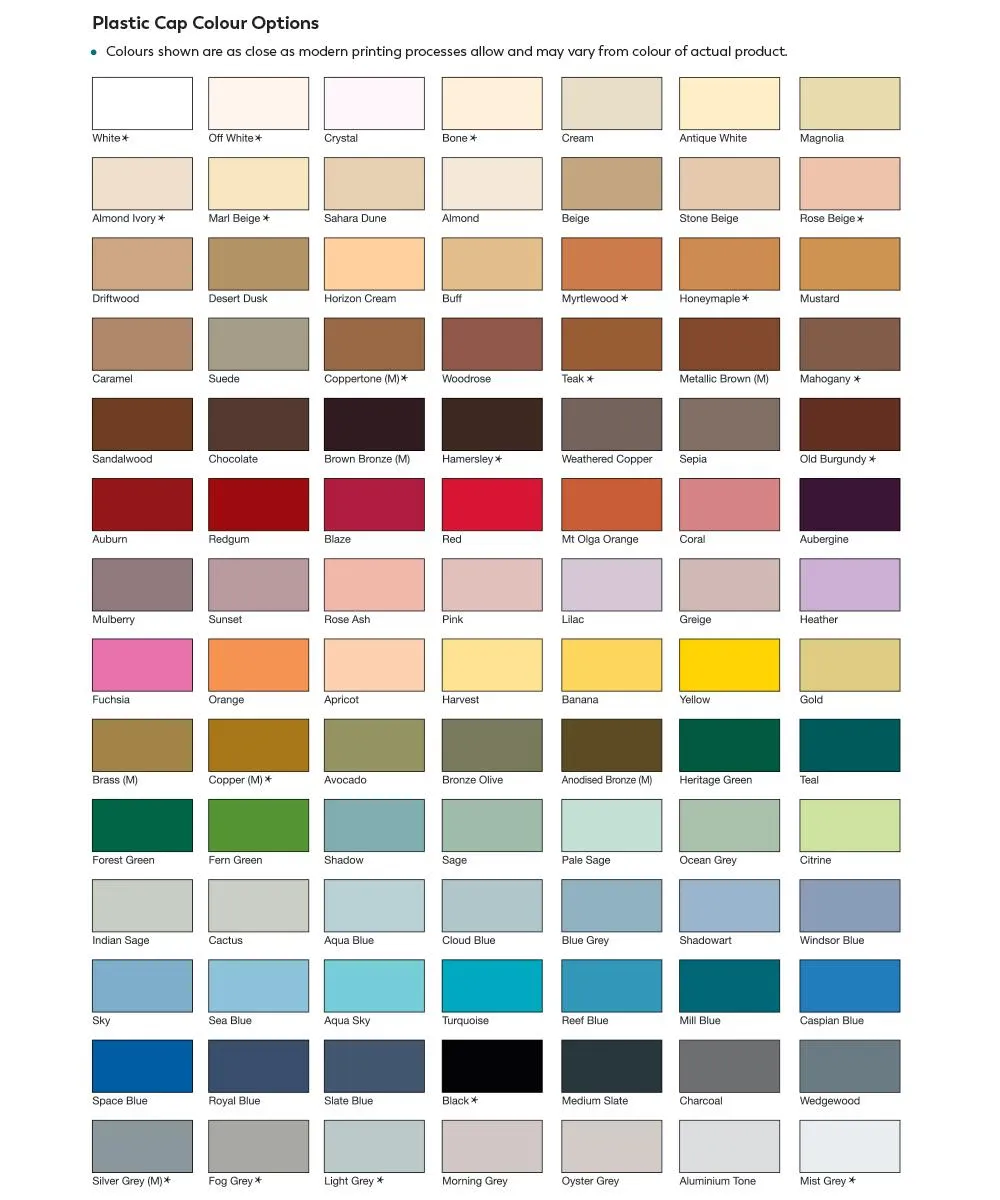 | Colour | White, Off White (parchment), Bone (N.A.W.), Black, Almond Ivory (champagne), Honeymaple (beech), Charcoal, Acorn Buff, Driftwood (pine), Almond Tone (silver grey), Sepia, Hamersley (jarrah), Cream, Stone Beige, Almond, Teak, Morning Grey, Fog Grey, Avocado, Desert Dusk, Caramel, Oyster Grey, Greige |