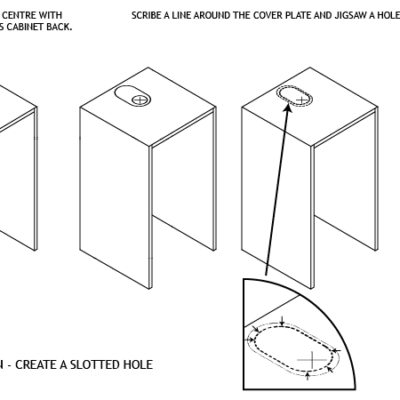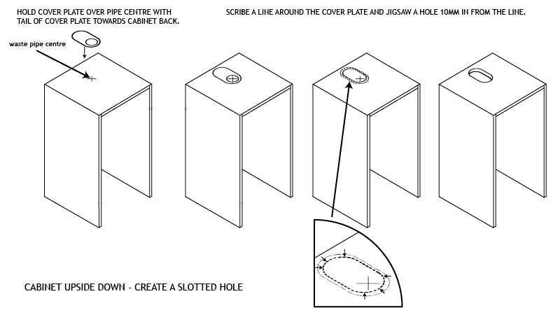 Once waste pipe centre has been established and marked on the underside of the cabinet, hold cover plate over pipe centre with tail of cover plate towards cabinet back. Scribe a line around the cover plate and jigsaw a hole 10mm in from the line. This will give sufficient gluing surface for the self adhesive backing of the cover plate. This size hole will also provide sideways as well as in and out cabinet positioning as is often required.