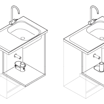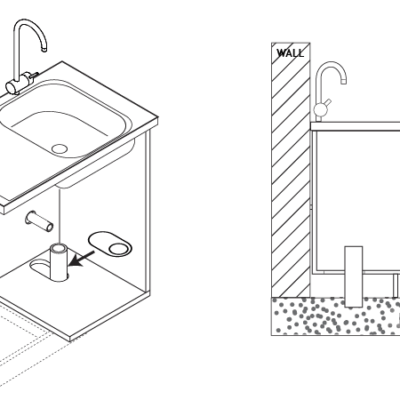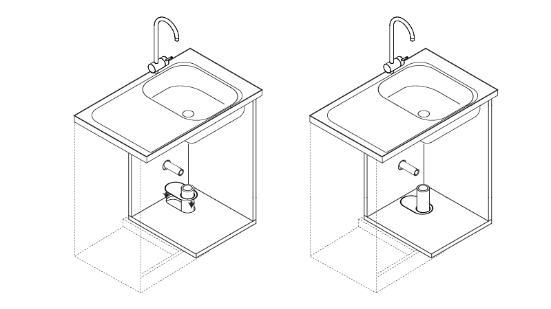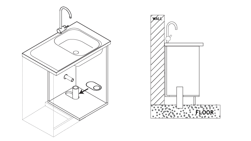 Once cabinet is in it’s fixed position the cover plate is lowered over the waste pipe and adhered to the cabinet floor hence covering over the slotted hole which can be roughly and quickly cut as it will never be seen. The cover plate can be easily cut with a knife or scissors if the tail is too long. For any existing plumbed applications where the cover plate can not slide over the end of a pipe, simply cut through one side of the rim so that the plate can be twisted.